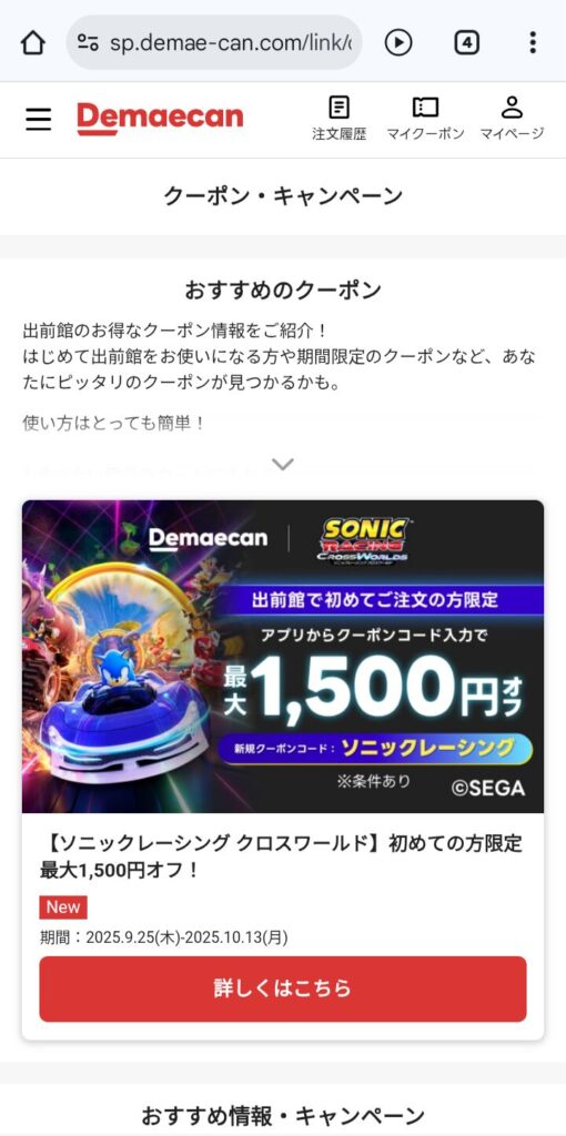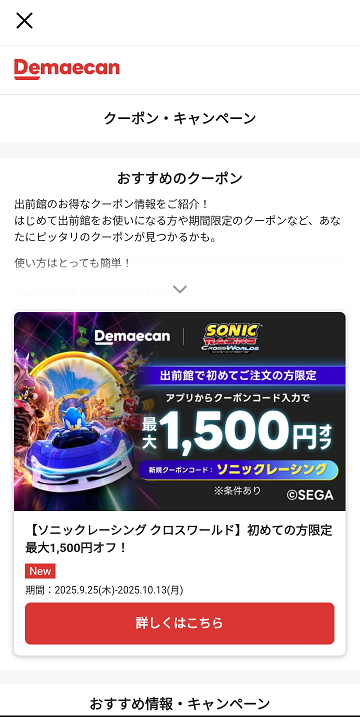まず、現在どんなクーポン・キャンペーンが配布・開催されているかをチェックします。出前館の公式アプリと公式Webサイトからは、以下のように確認できます。