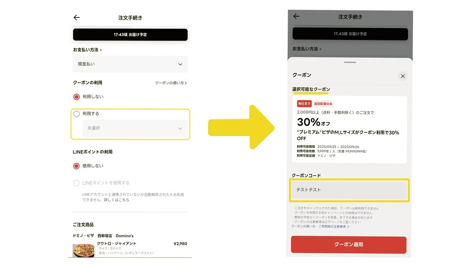 クーポンは、個別の「クーポンコード」を会計時に入力することで利用が可能になります。実際の手順を見てみましょう。
