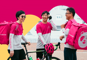 ピンクのユニフォームと配達BOXが印象的なfoodpanda(フードパンダ)。